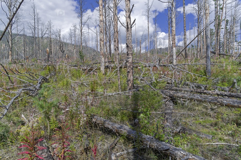 Лес после пожара. Вид с Большой Байкальской тропы. Озеро Байкал. Иркутская область, Россия. Август