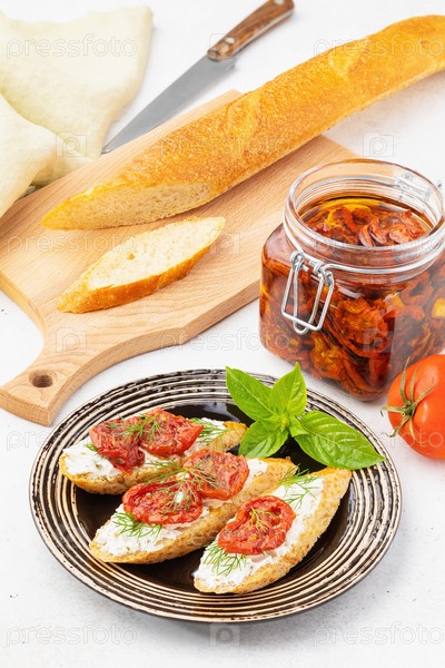 Нарезанный хлеб, открытая банка и готовые бутерброды с вялеными помидорами, сыром и укропом в тарелке на столе