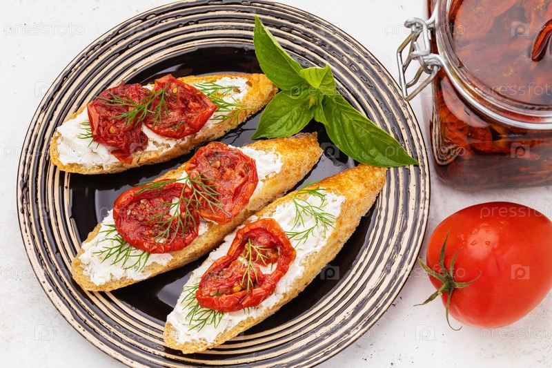 Вид сверху на три бутерброда с вялеными помидорами, сыром и укропом в тарелке на столе