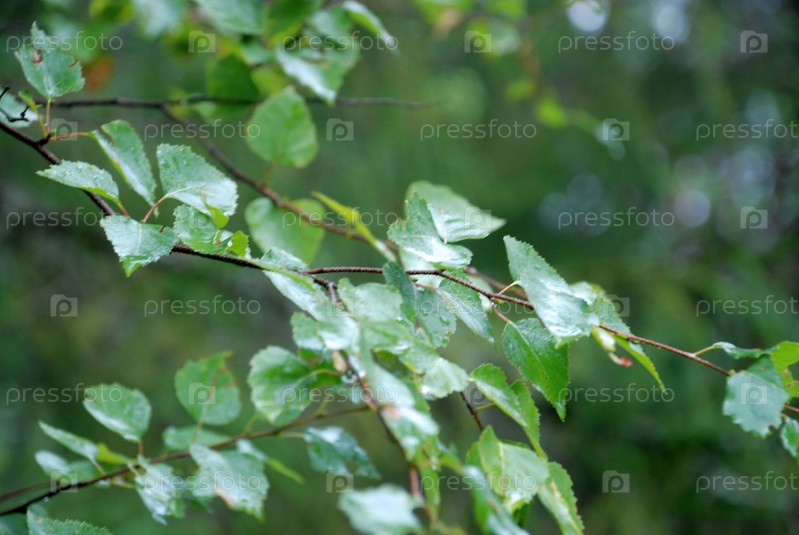 Мокрые листья березы на тонких ветках