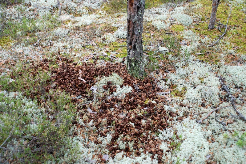 На земле лежит куча упавших сосновых шишек