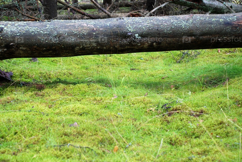 Старый высокий упавший ствол в еловом лесу