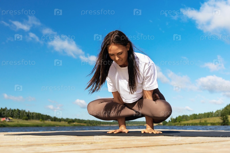 Женщина практикует йогу, выполняет балансовую асану, стойку на руках в позе лотоса, тренируется в спортивной одежде на берегу озера теплым солнечным утром