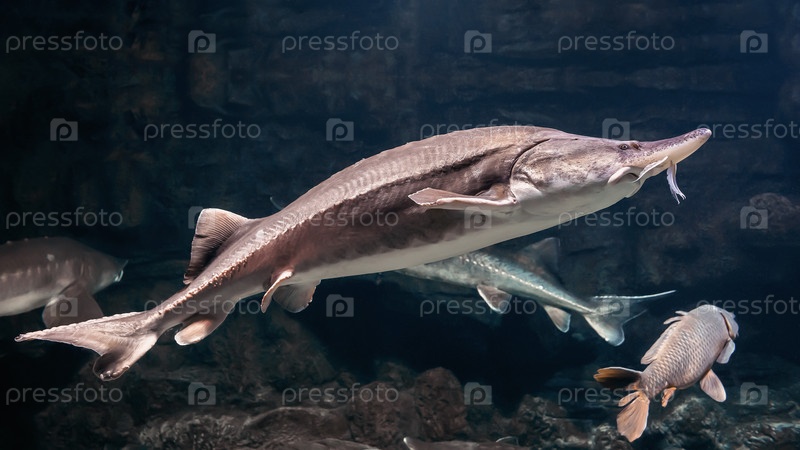 Крупная пресноводная рыба Калуга крупным планом, род Белуга, семейство осетровых