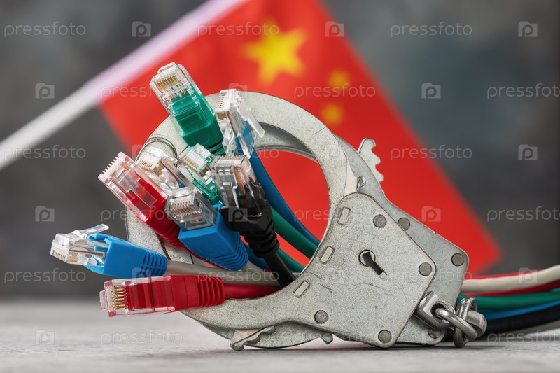 Закрытые наручники на сетевых проводах и флаг Китая на абстрактном фоне, концепция на тему наказания за преступления в сети
