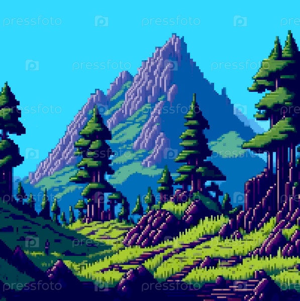 Пейзаж 8-битный пиксель-арт. Летний природный ландшафт горный пейзаж аркадная видеоигра фон