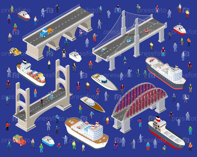 Мост Люди городской инфраструктуры изометрические для игр 3D иллюстрации