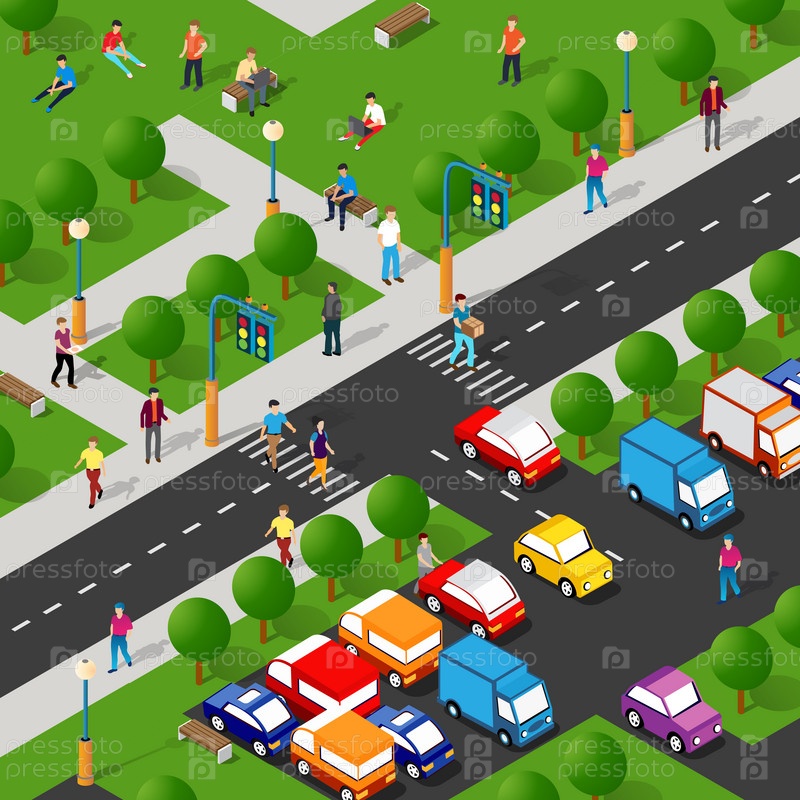 Изометрический парк с деревьями и людьми со скамейками