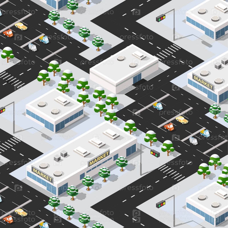 Изометрическая 3d улица в центре города, часть архитектурного района
