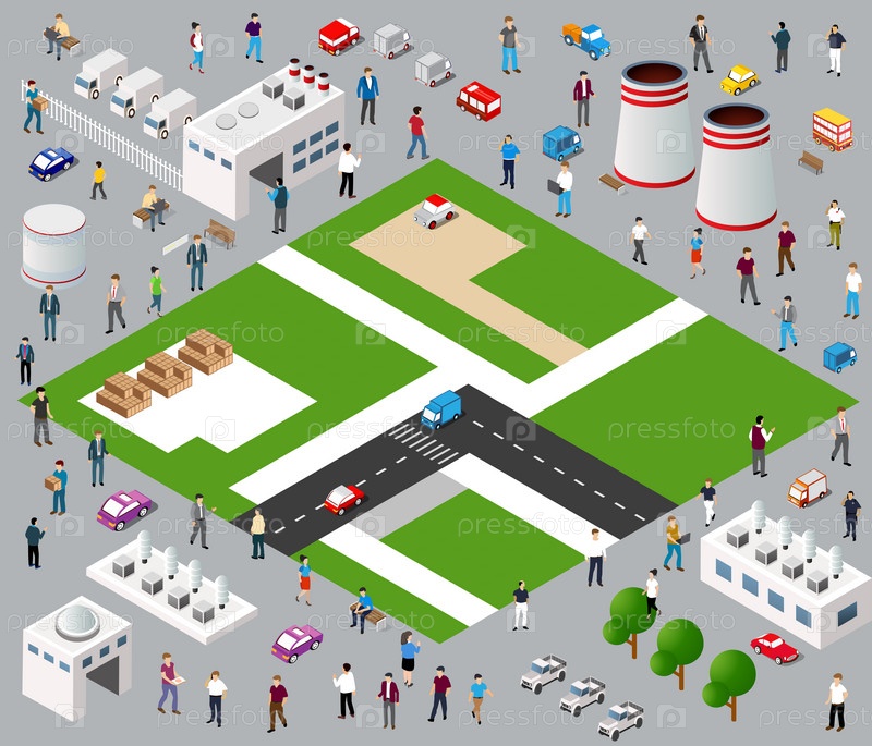 3D изометрическая визуализация промышленной зоны с улицами и людьми. 3D-иллюстрация для дизайна и игровой индустрии