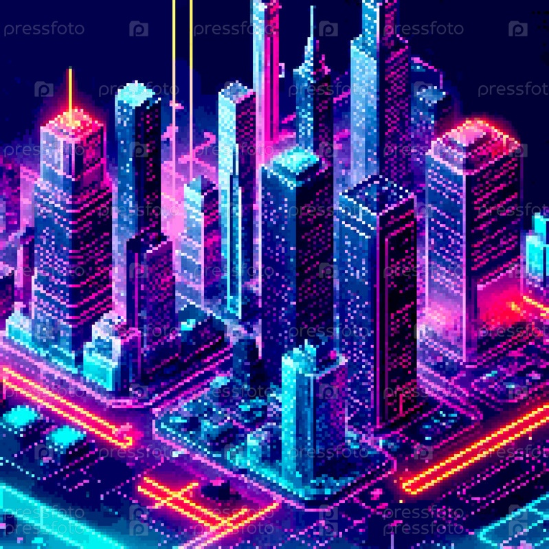 Трехмерная проекция пиксельного 8-битного художественного вида на город. 3D-иллюстрация