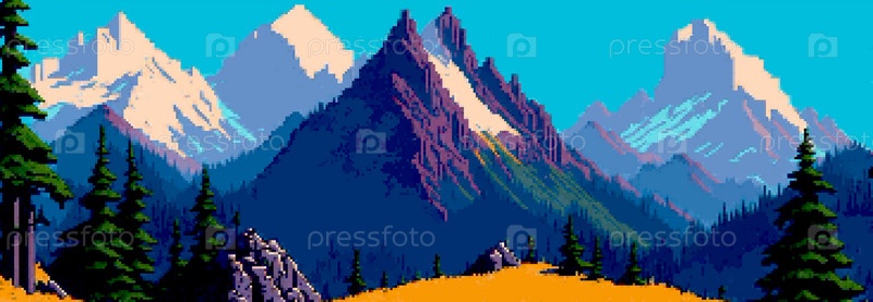 Пейзаж 8-битный пиксель-арт. Летний природный ландшафт горный пейзаж аркадная видеоигра фон