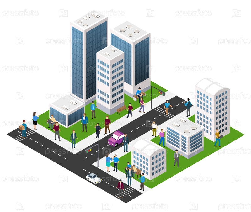 Изометрический индивидуальный образ жизни, общение в городской среде на остановке с местами, образы жизни людей и деревьев, 3D-иллюстрация
