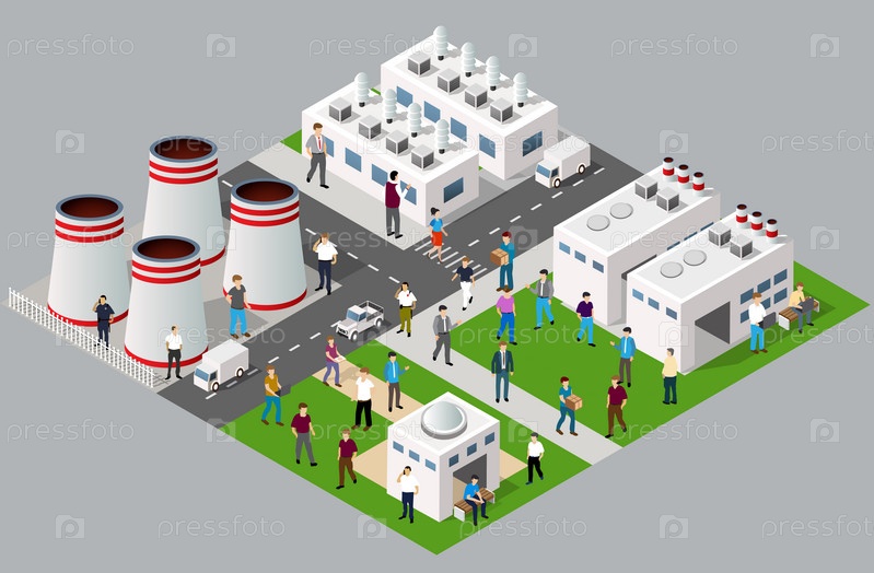 Изометрическая 3D-иллюстрация городского квартала Промышленный район с улицами и людьми