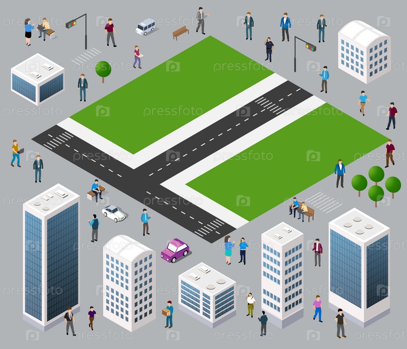 Изометрический индивидуальный образ жизни, общение в городской среде на остановке с местами, образы жизни людей и деревьев, 3D-иллюстрация