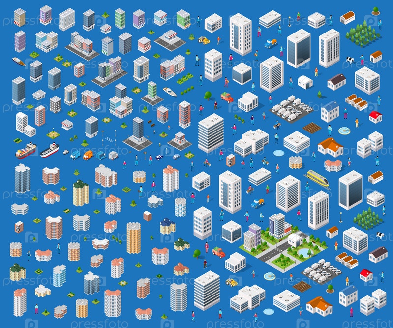 Набор современных изометрических зданий и домов для площадок и игр. Габаритные виды небоскребов и городских территорий с транспортом