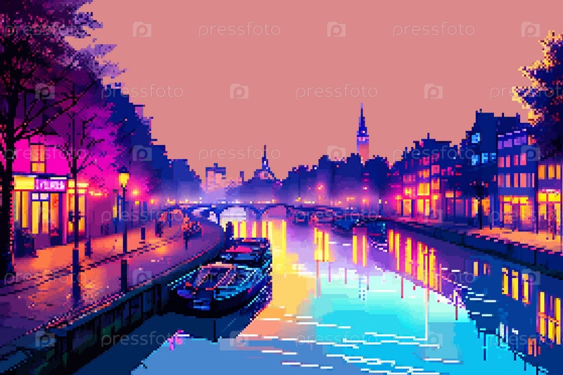 Пейзаж города 8-битный пиксель арт. Летний природный пейзаж, городские пейзажи, фон для аркадных видеоигр