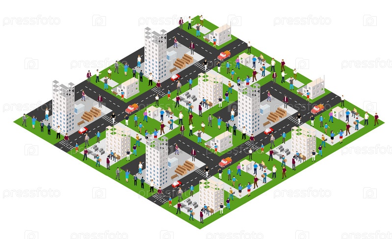 Сцена городского образа жизни на городские темы с домами, автомобилями, людьми,