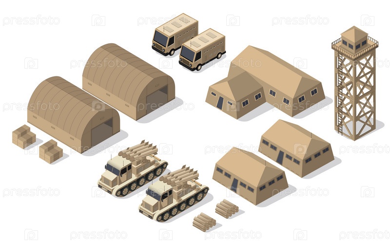 Набор армейских вооруженных сил изометрические вооруженные военно-транспортные объекты и военная боевая техника силовые графические элементы танковая машина 3D иллюстрация