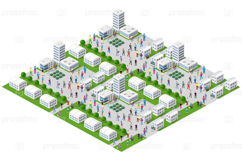 Сцена городского образа жизни на городские темы с домами, автомобилями, людьми,