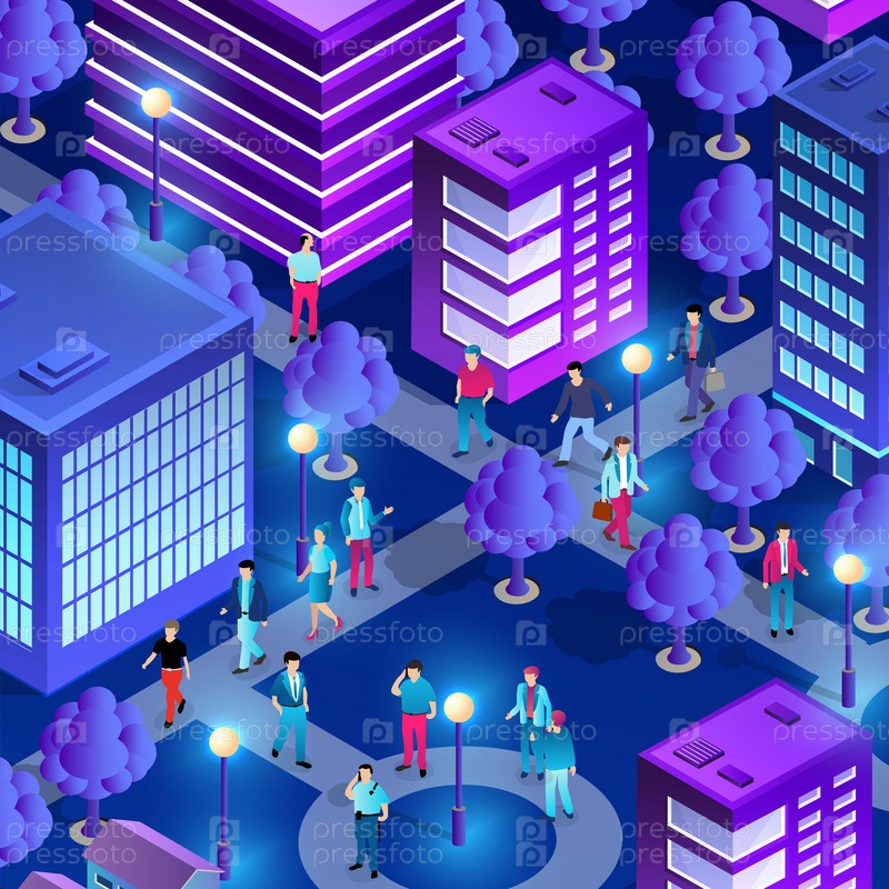 Центр города, ночной неоновый ультрафиолет, гуляющие люди
