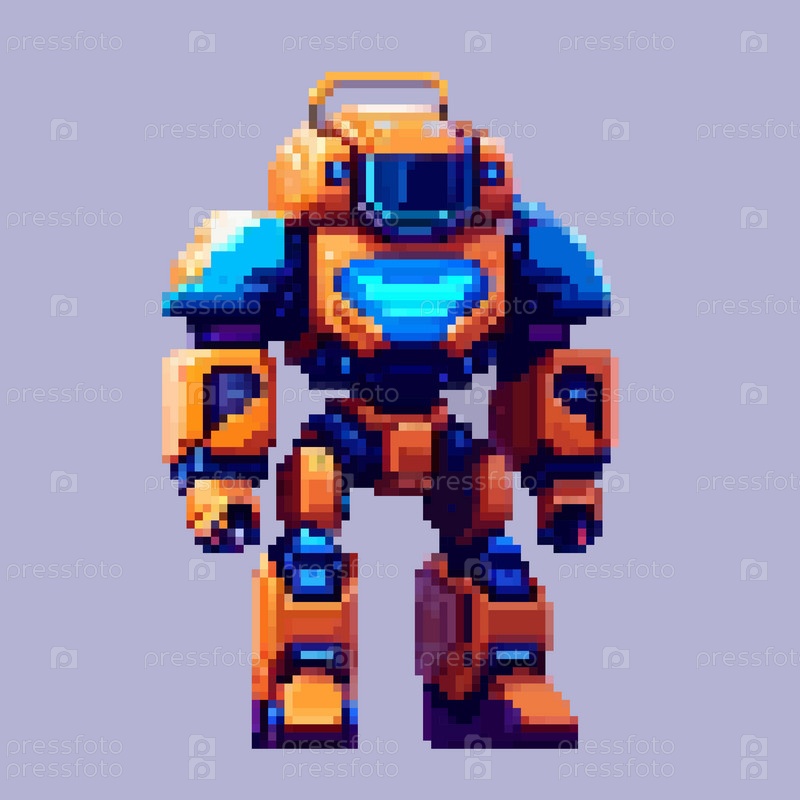 Робот-пиксельный персонаж для 8-битных игровых пейзажей, фон для аркадной видеоигры