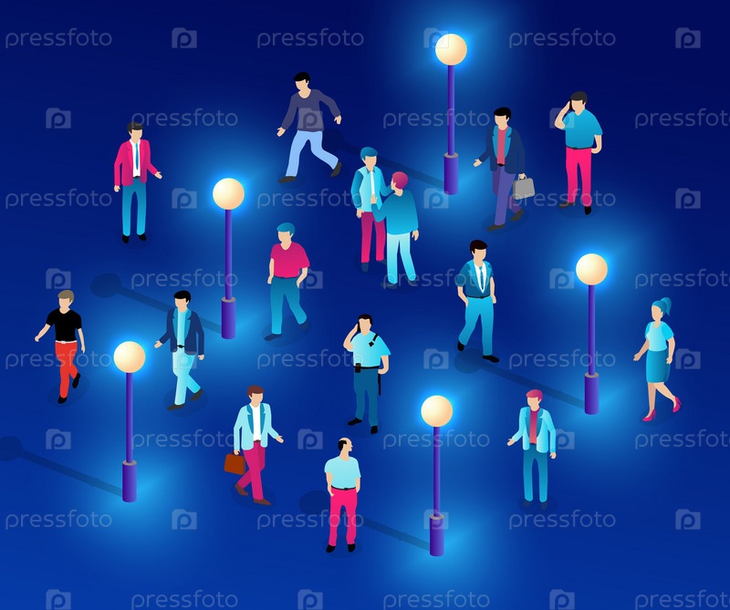 Центр города, ночной неоновый ультрафиолет, гуляющие люди