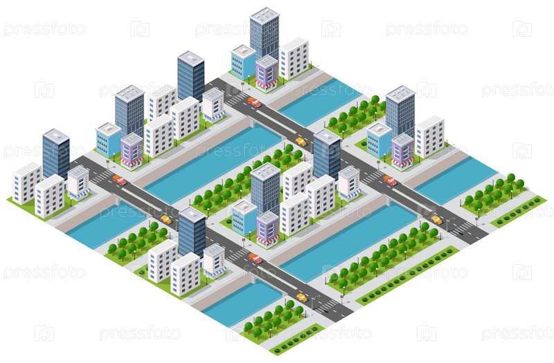 Изометрическая 3D-иллюстрация Город с набережной реки с людьми, идущими по мостам, транспортным улицам