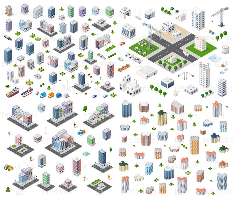 Изометрический набор Пересечение улиц 3D иллюстрация городского квартала с улицами, людьми и автомобилями. фоновая иллюстрация для индустрии дизайна и игровой промышленности