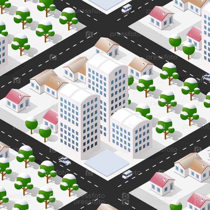 Изометрическая 3d улица в центре города, часть архитектурного района