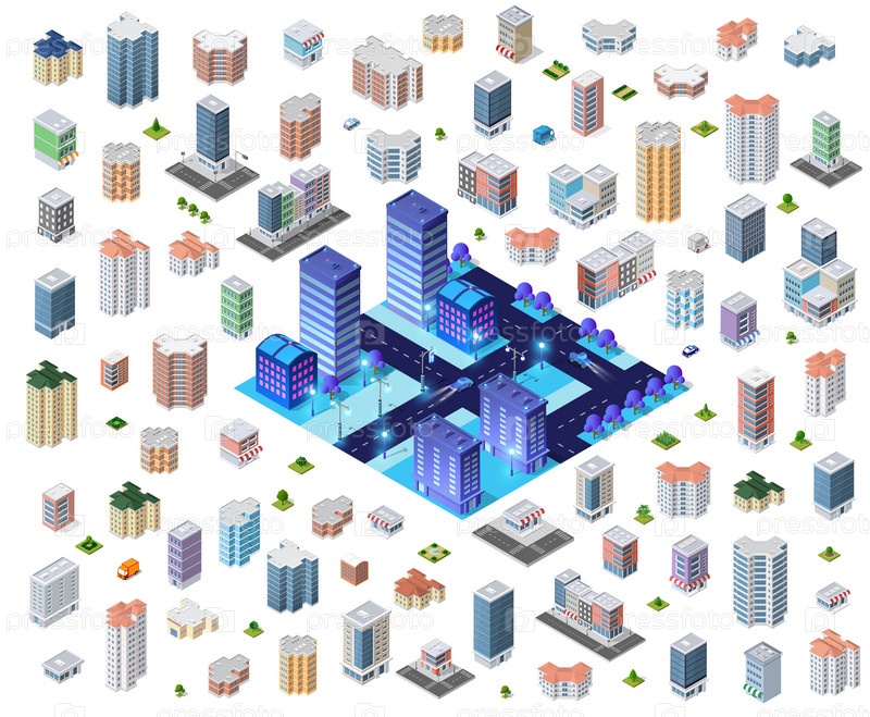 Набор современных изометрических зданий и домов для площадок и игр. Габаритные виды небоскребов и городских территорий с транспортом