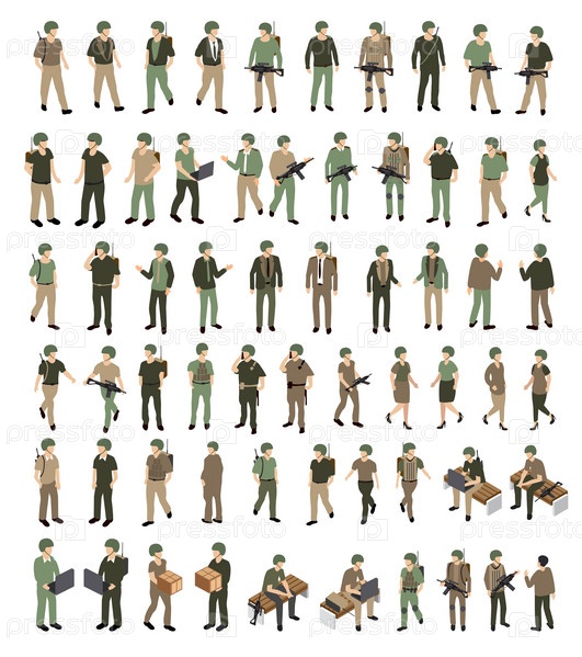 Набор человеческих военных солдат, армейских камуфляжей, боеприпасов, ветеранов, военных, военных для дизайна и видеоигр. Изометрическая векторная иллюстрация
