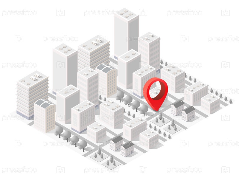 Изометрический вид городского квартала с домами, улицами и деревьями