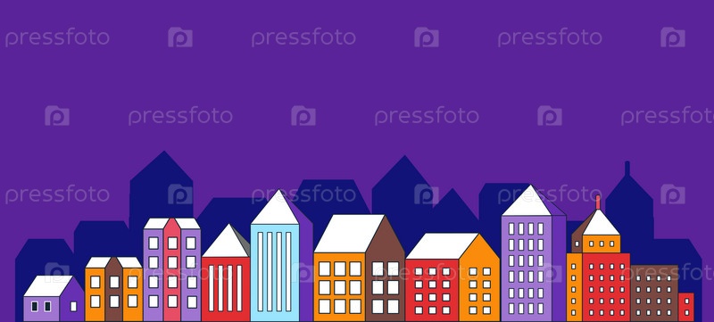 Силуэт зимнего рождественского новогоднего плоского центра города с домами, окнами и крышами, покрытыми снегом. 3D иллюстрация