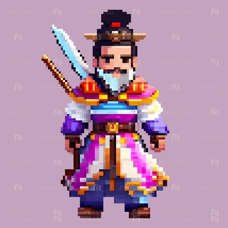 Японский воин-самурай, пиксельный персонаж для 8-битных игровых пейзажей, фон для аркадной видеоигры