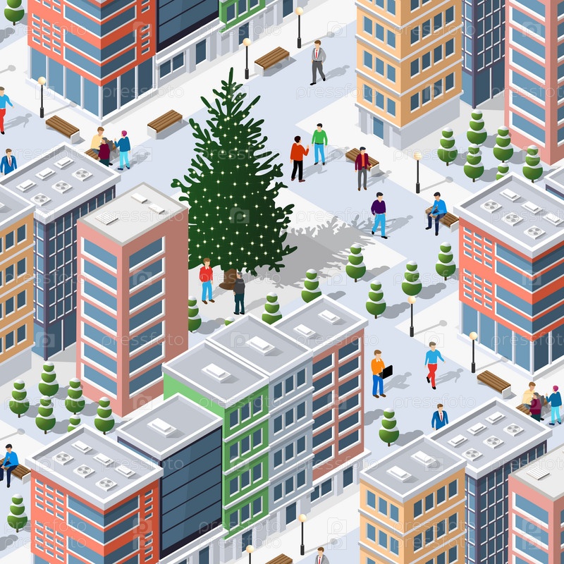 Представлена изометрическая 3D-иллюстрация зимнего города, состоящая из домов, зданий, автомобилей и других элементов дизайна.Рождественский 3D-дом стоит в зимнем лесу