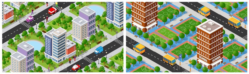 Иллюстрация городского пейзажа с использованием 3D изометрического изображения домов, улиц