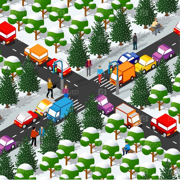 Изометрическая 3D-иллюстрация зимнего города, состоящего из автомобилей