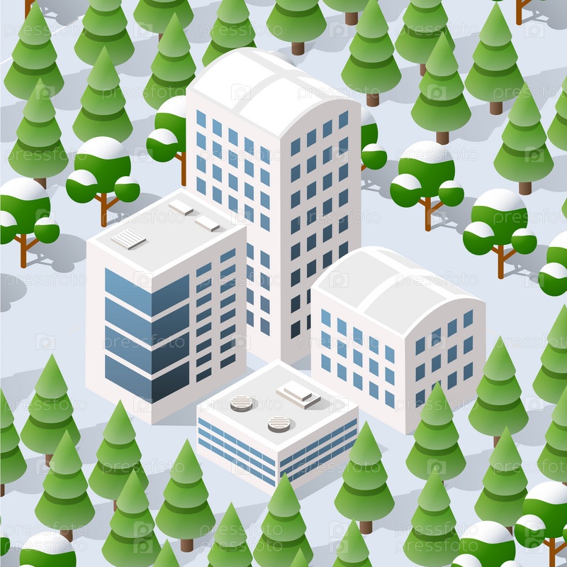 Городские дома квартально стоят в Рождественском зимнем лесу. 3D изометрическая иллюстрация
