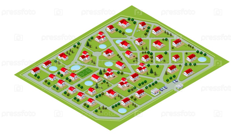Карта карты коттеджного таунхауса, бунгало, жилого дома, деревни вилл в изометрической трехмерной иллюстрации сверху. Вид улиц, домов, участков под строительство и продажу недвижимости