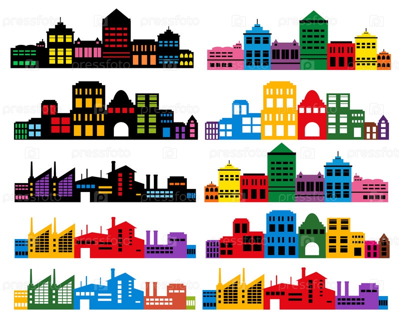 Пейзажный набор зданий, вырисовывающихся на белом фоне