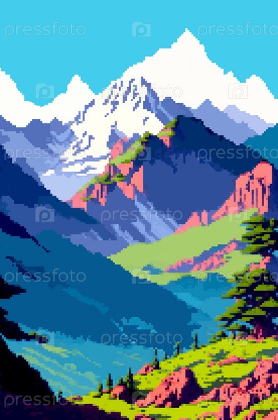 Пейзаж 8-битный пиксель-арт. Летний природный ландшафт горный пейзаж аркадная видеоигра фон