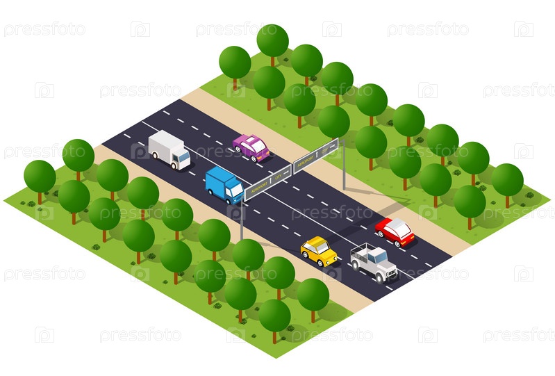 Транспортная городская дорога с деревьями. Изометрический вид сверху