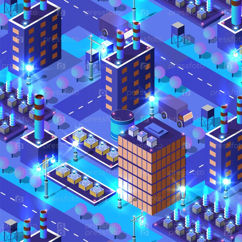 Городские промышленные заводы Изометрические ночные огни Архитектура 3D иллюстрация