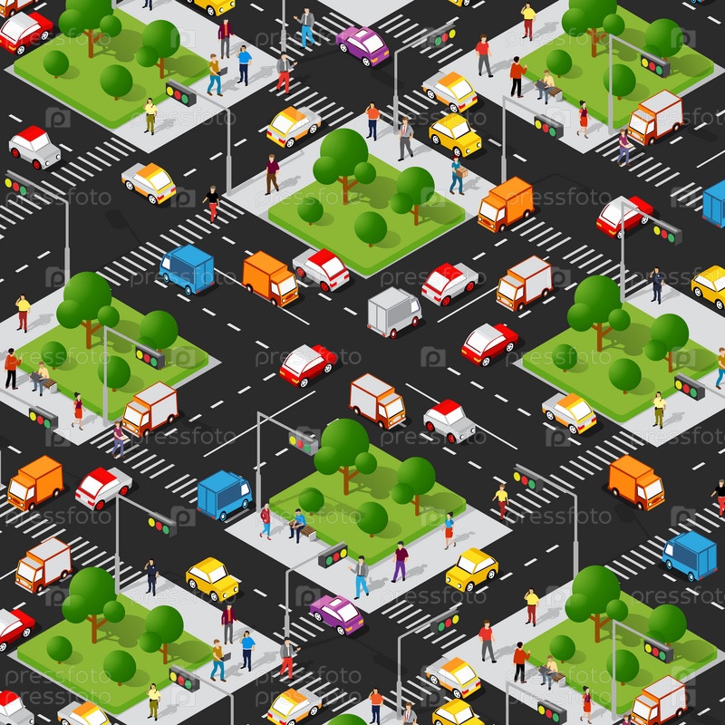 Пересечение дорог, изометрическая 3D городская улица с автомобилями, деревьями