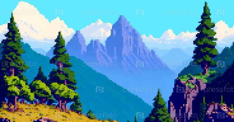 Пейзаж бесшовный 8-битный пиксель. Летний природный горный пейзаж аркадная видеоигра фон