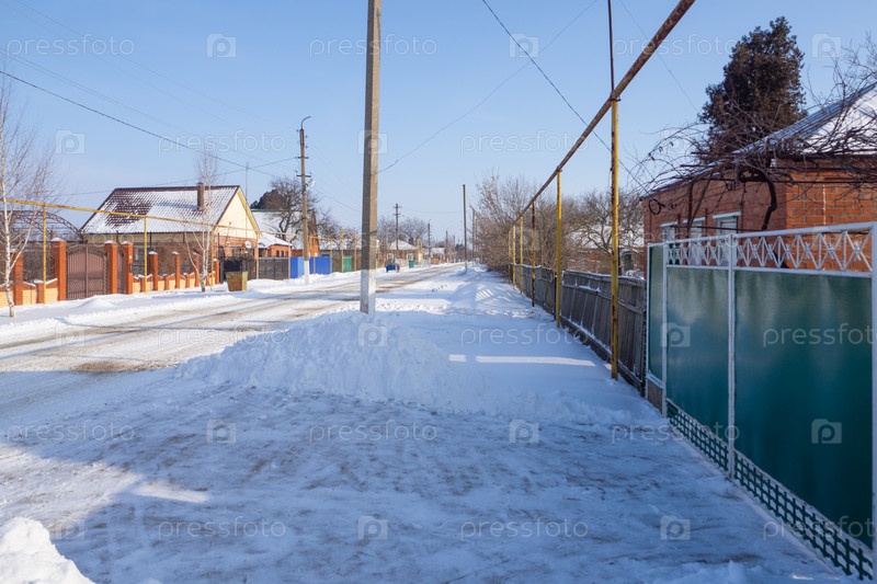 Улица с частными домами в солнечный зимний день. зимний пейзаж деревенские домики, покрытые снегом