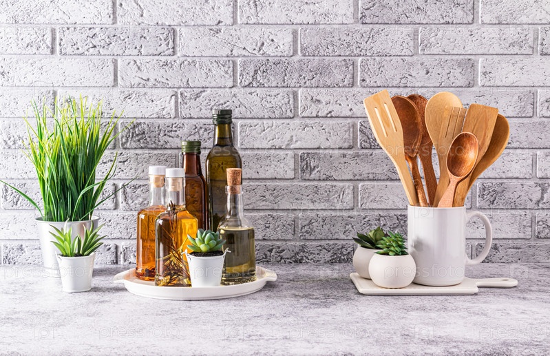 Различные бутылки для хранения масла на стильном белом подносе в интерьере кухонного склада. Серая кирпичная стена. Стильный кухонный фон