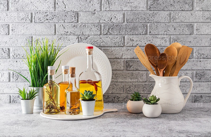 Красивый кухонный фон из современных столешниц с различными местами для хранения вещей. экологически чистая кухня. Современный интерьер