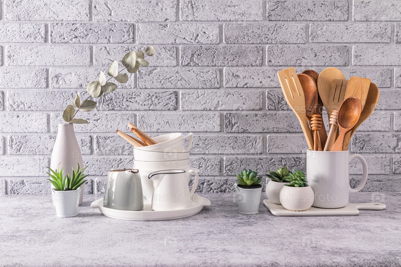 Современное кухонное пространство в светлых тонах. Набор кухонной утвари на мраморной столешнице. экологически чистая кухня